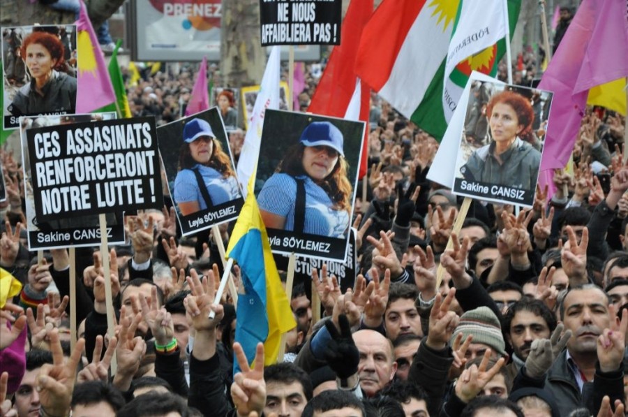 Sous la pluie et une nuée de drapeaux dont certains à l'effigie d'Abdullah Ocalan, le leader du PKK emprisonné en Turquie, les Kurdes, notamment venus d'Allemagne, ont rendu un hommage à Sakine Cansiz, Fidan Dogan et Leyla Soylemez, tuées de plusieurs balles dans la tête au centre d'information du Kurdistan dans le centre de Paris.